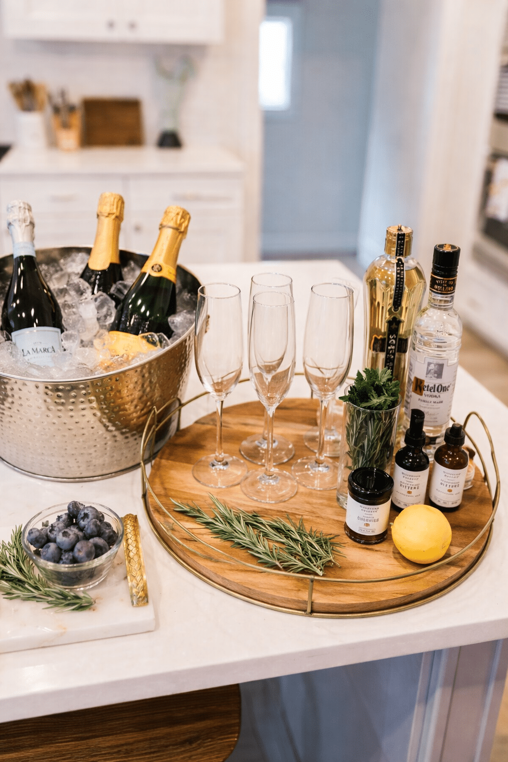 Whether it’s an intimate dinner or a larger gathering, a champagne bar adds a festive touch that makes the moment feel special without requiring a full cocktail setup.