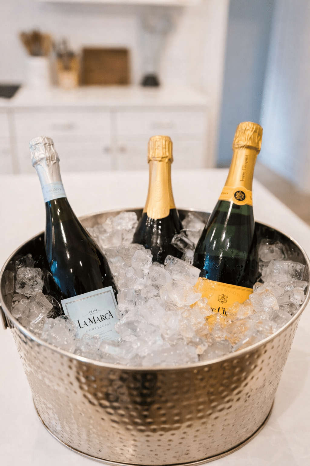 - Chill the Champagne. Place your champagne or prosecco bottles in an ice bucket and chill for at least one hour before serving.