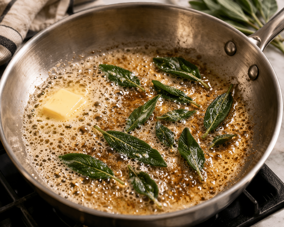 - Make the Brown Butter Sage Sauce. In a large skillet over medium heat, melt the butter. Add the sage leaves and cook 4–5 minutes, swirling occasionally, until the butter turns golden and aromatic. Watch closely — brown butter goes from perfect to burnt quickly.