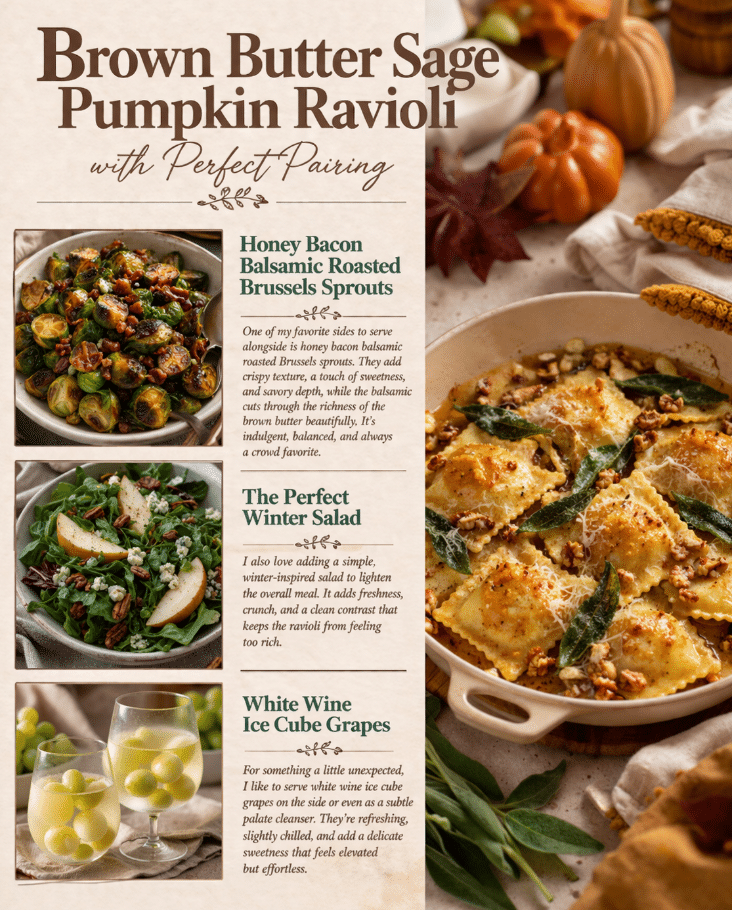 When I serve this Brown Butter Sage Pumpkin Ravioli, I like to pair it with elements that balance its richness and highlight its warmth, creating a meal that feels layered, intentional, and never too heavy.