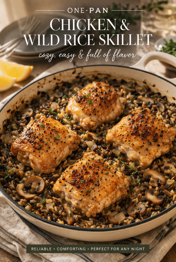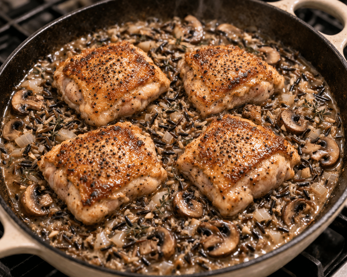 Chicken Thighs with Wild Rice is a one-pan, oven-baked dish that combines juicy, well-seasoned chicken thighs with nutty, hearty wild rice, typically cooked together in a flavorful broth with aromatics like garlic, onions, herbs, and often vegetables like mushrooms.