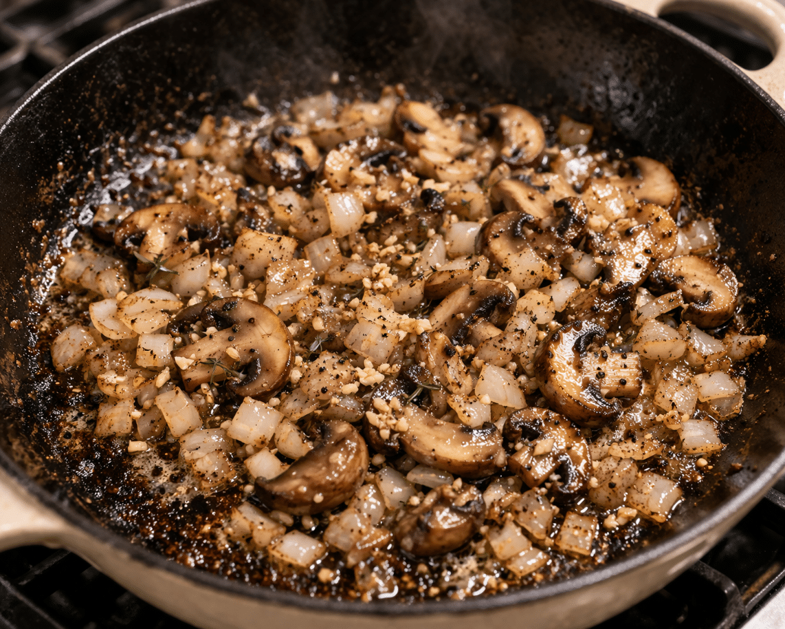 - Sauté the aromatics. In the same skillet, add remaining oil, diced onion, garlic, and mushrooms. Sauté until softened, about 5 minutes.