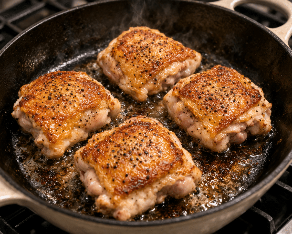 Give your chicken thighs enough space when searing. If they’re too close together, they’ll steam instead of crisp. Work in batches if needed—this step is worth doing properly.