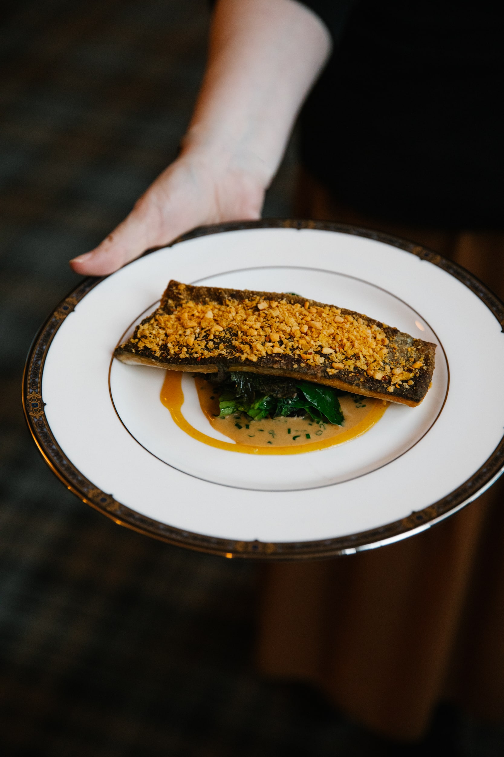 For the main course, the Pan Fried Rainbow Trout was the dish that stayed with me. A long golden fillet crusted in fried peanut crumb, laid over local arugula and kale with young ginger and brown butter jus — precise and deeply comforting at the same time. The Peach Lacquered Duck with curried butternut squash, wood oven roasted cabbage, charred peach jam, and pecan dukkah spoke directly to Georgia’s larder in the language of someone who has spent thirty years listening to it. And the Vegetarian Haggis Pie — grilled heirloom potato salad, caramelized turnip cream, crispy onions — was a love letter to Scottish tradition reimagined entirely through vegetables, and one of the most talked-about dishes at the table.