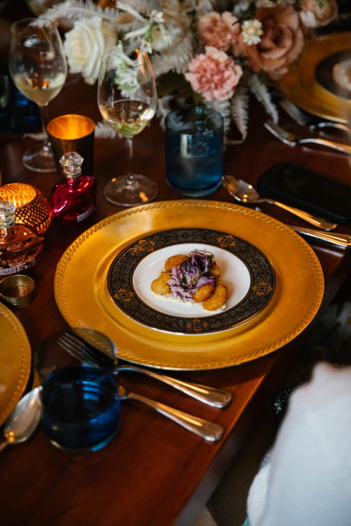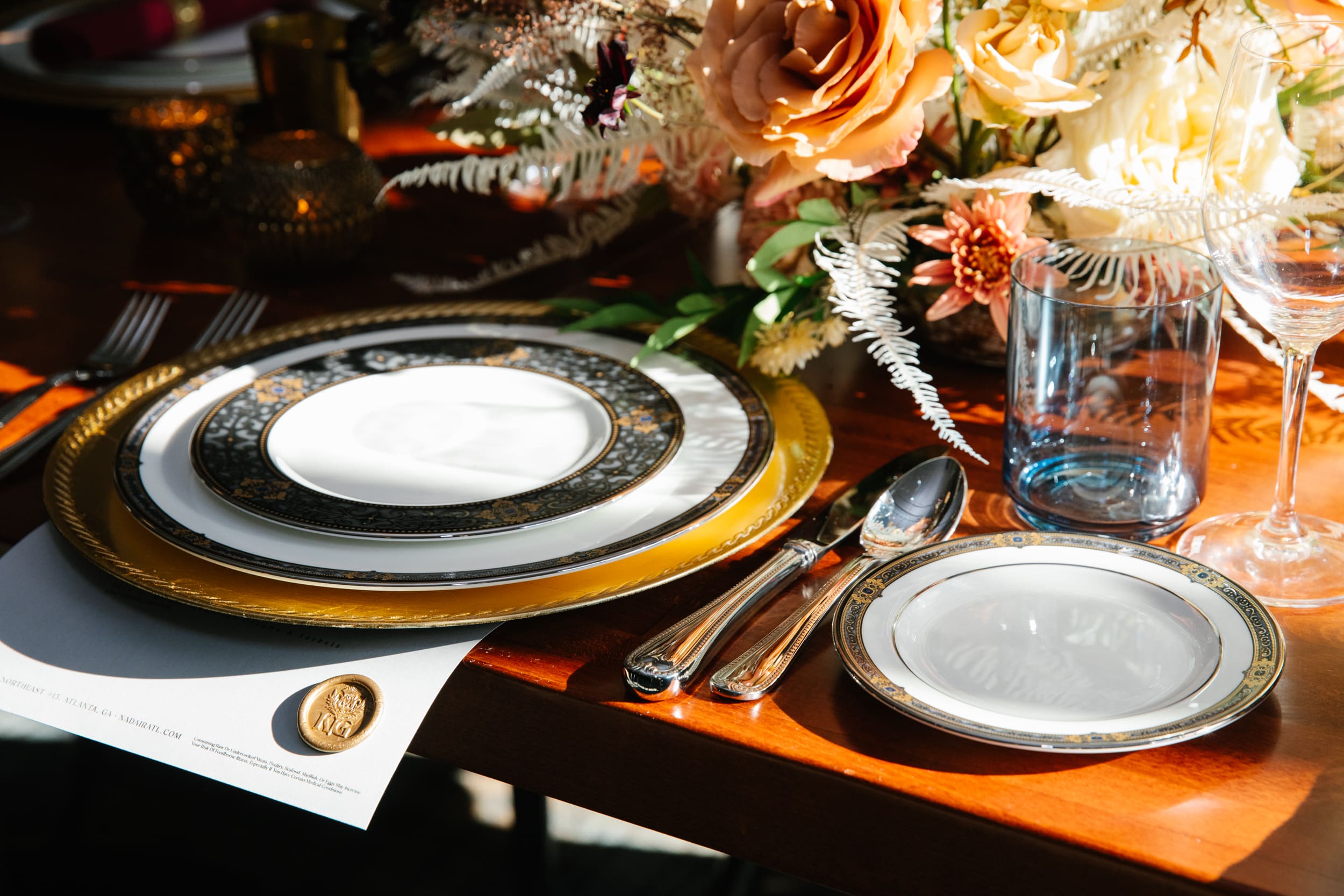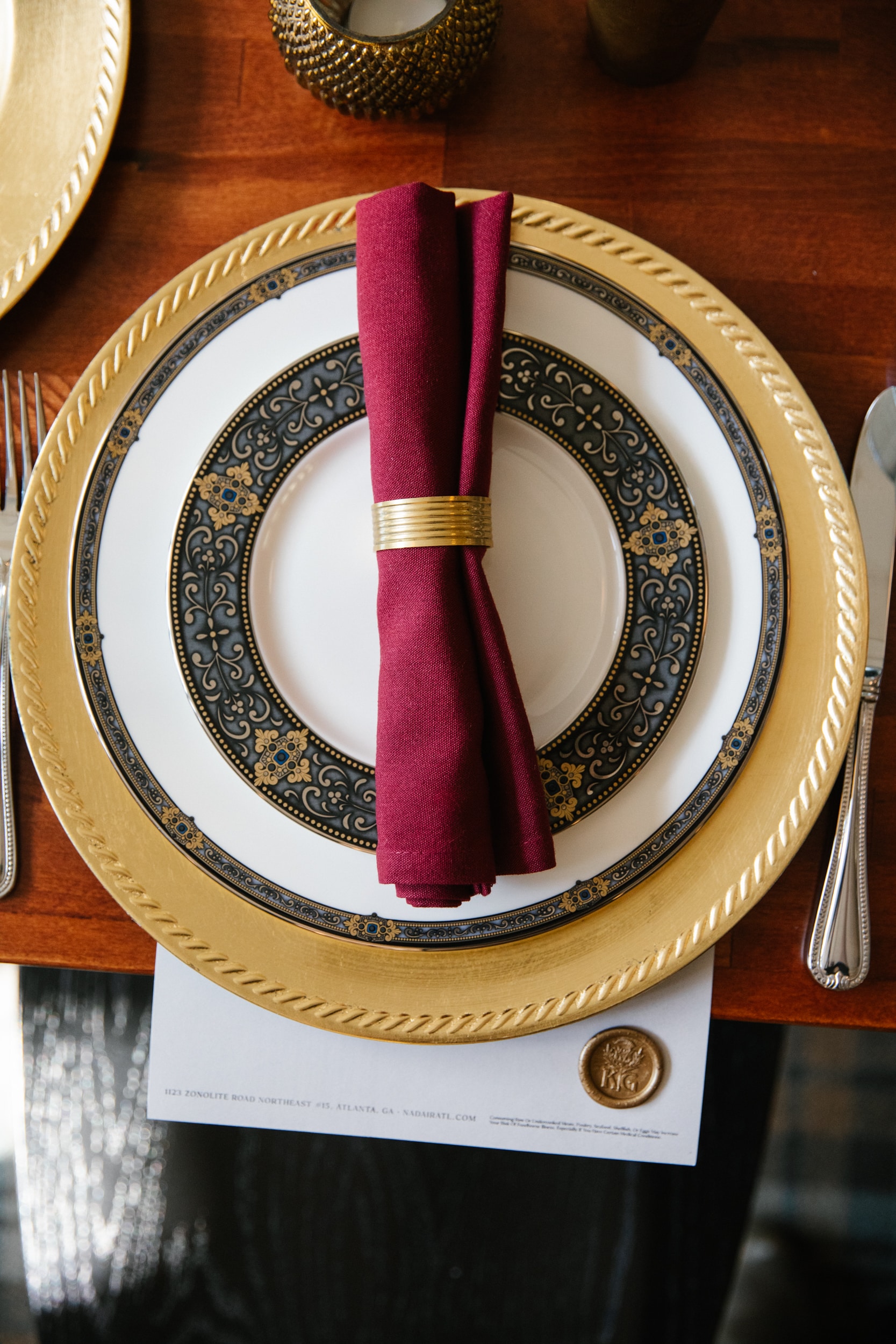 At each setting: Lenox china in navy and gold resting on gold charger plates, deep cobalt blue glassware, gold mercury votive candles, and deep crimson napkins folded at each place. The bare walnut table anchored everything — no linens, letting the wood’s warmth do the work beneath all that color and texture. The menu card, embossed with the Nàdair clan crest and sealed with a gold KG wax seal, completed each setting. Guests picked it up before they sat down. That detail alone set the tone for the evening.