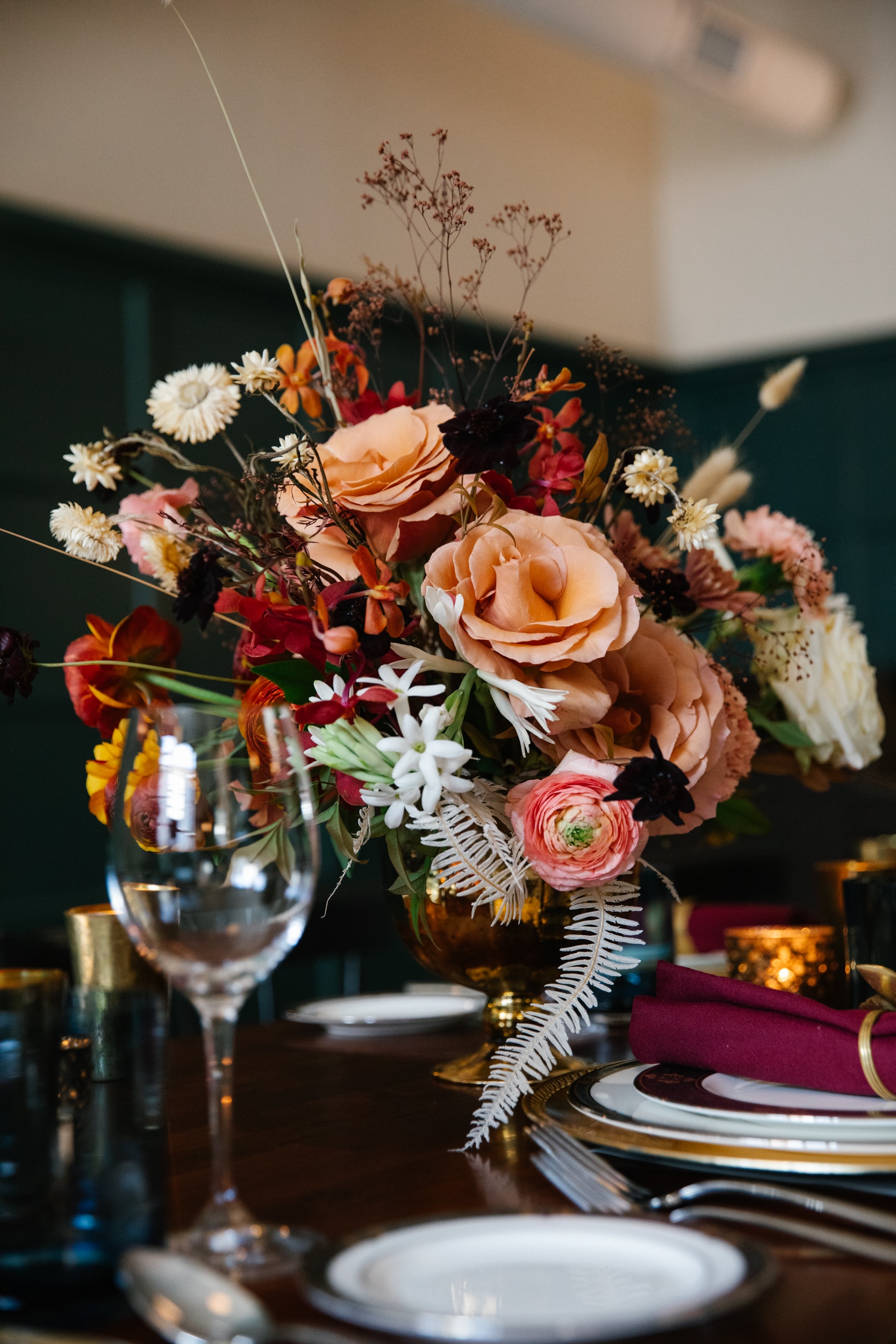 Working with our in-house florist Ali of Lunaria Events, we built multiple arrangements in amber and bronze compote vessels that ran the full length of the table. The florals were the centerpiece in every sense — peach and ivory garden roses, blush ranunculus, deep burgundy scabiosa, rust and red orchids, dried strawflowers, white skeleton ferns, and delicate dried branches that reached upward as if still growing. Against the deep teal wall, the warm amber and rust tones of the arrangements glowed. It was autumnal without being obvious about it.