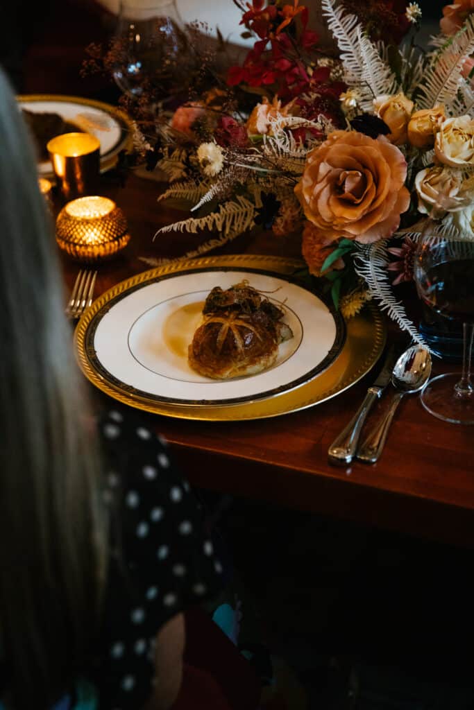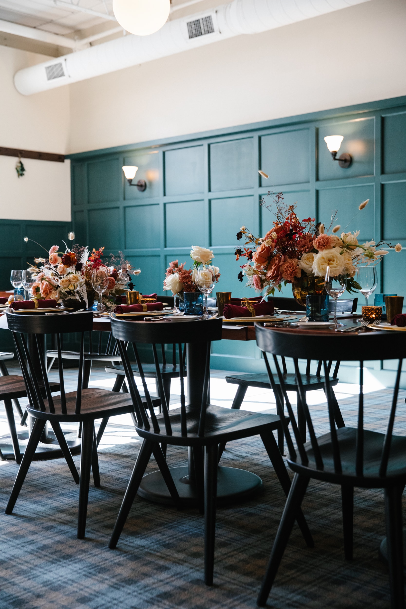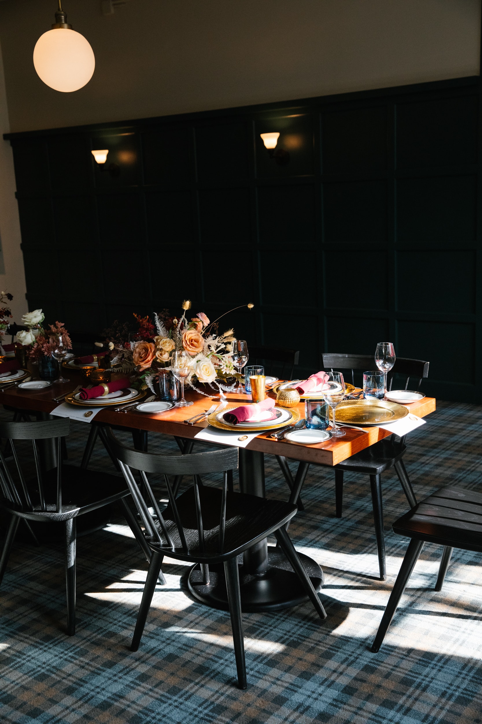 For this dinner, I wanted the tablescape to feel like a conversation with the room — not compete with it. Nàdair’s interior already speaks in deep, considered tones: teal paneled walls, warm walnut wood, cognac leather, candlelight. The goal was to bring something that felt equally intentional, equally layered, and rooted in the season we were in.