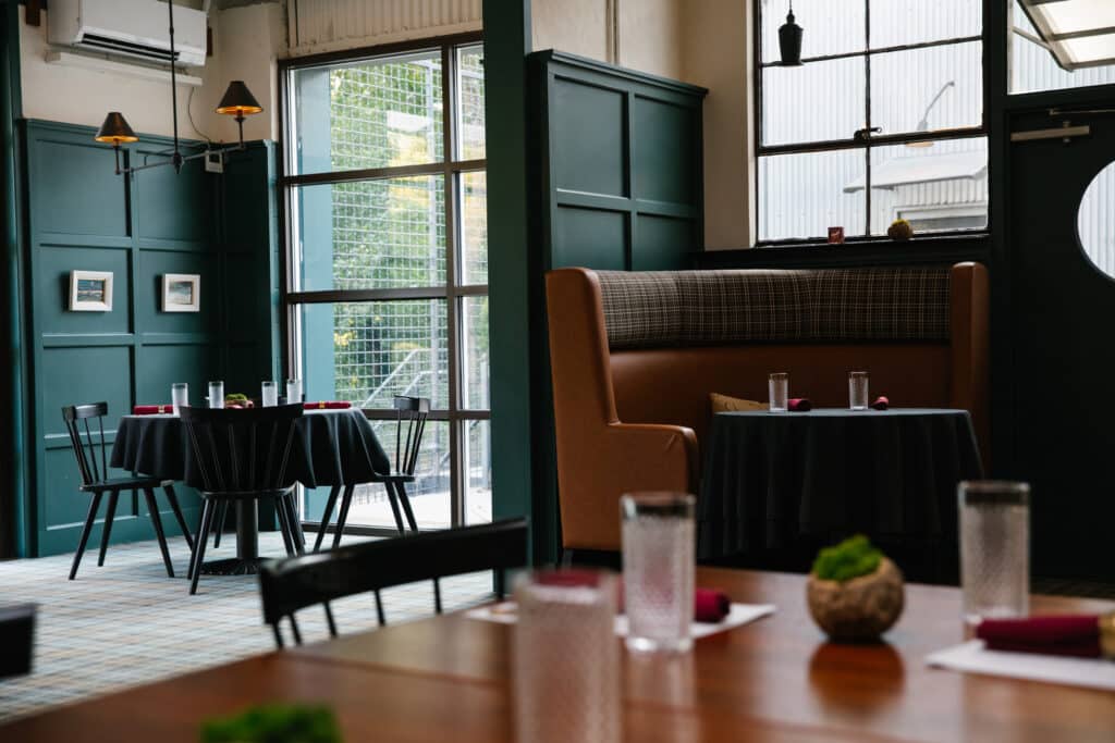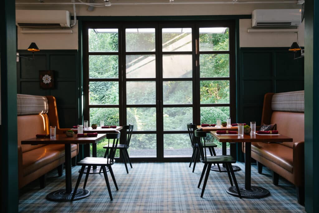 Step inside and the room tells the rest of the story. Tartan plaid carpet runs wall to wall. Tartan curtains frame the doorways. Cognac leather banquettes with tartan upholstery line the walls alongside black Windsor chairs and floor-length black tablecloths. Small landscape paintings — Scottish countryside, you imagine — hang quietly on the deep teal paneled walls. The bar is a destination in itself: dark walnut shelving stacked floor to ceiling with one of the most serious whisky collections you will find in Atlanta, antlers and a mounted pheasant presiding over it all from above. And through the large industrial windows and floor-to-ceiling glass doors, Zonolite Park’s greenery presses so close you feel held by it rather than separated from it. Every element of this room was chosen. Nothing is accidental. That is the point.