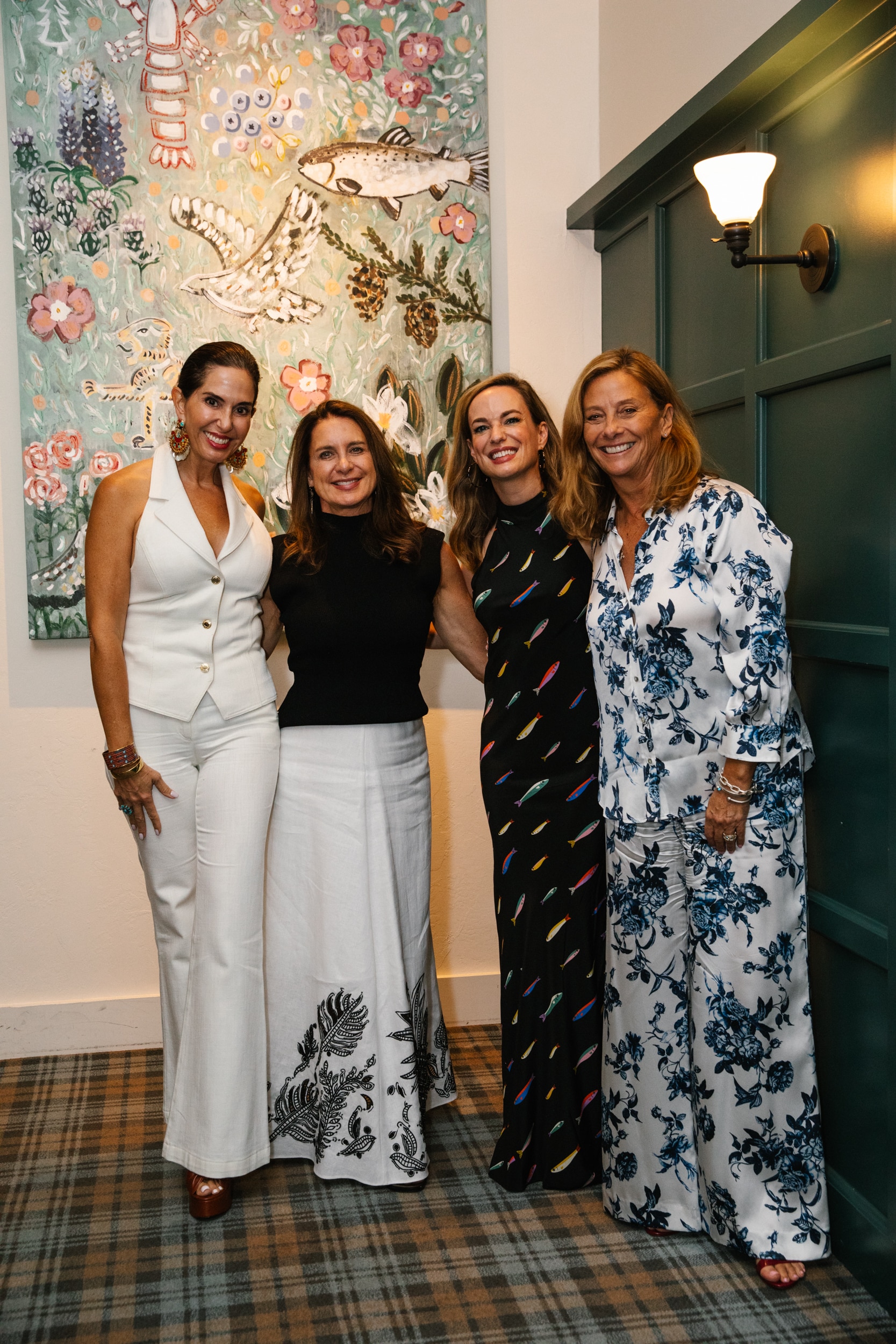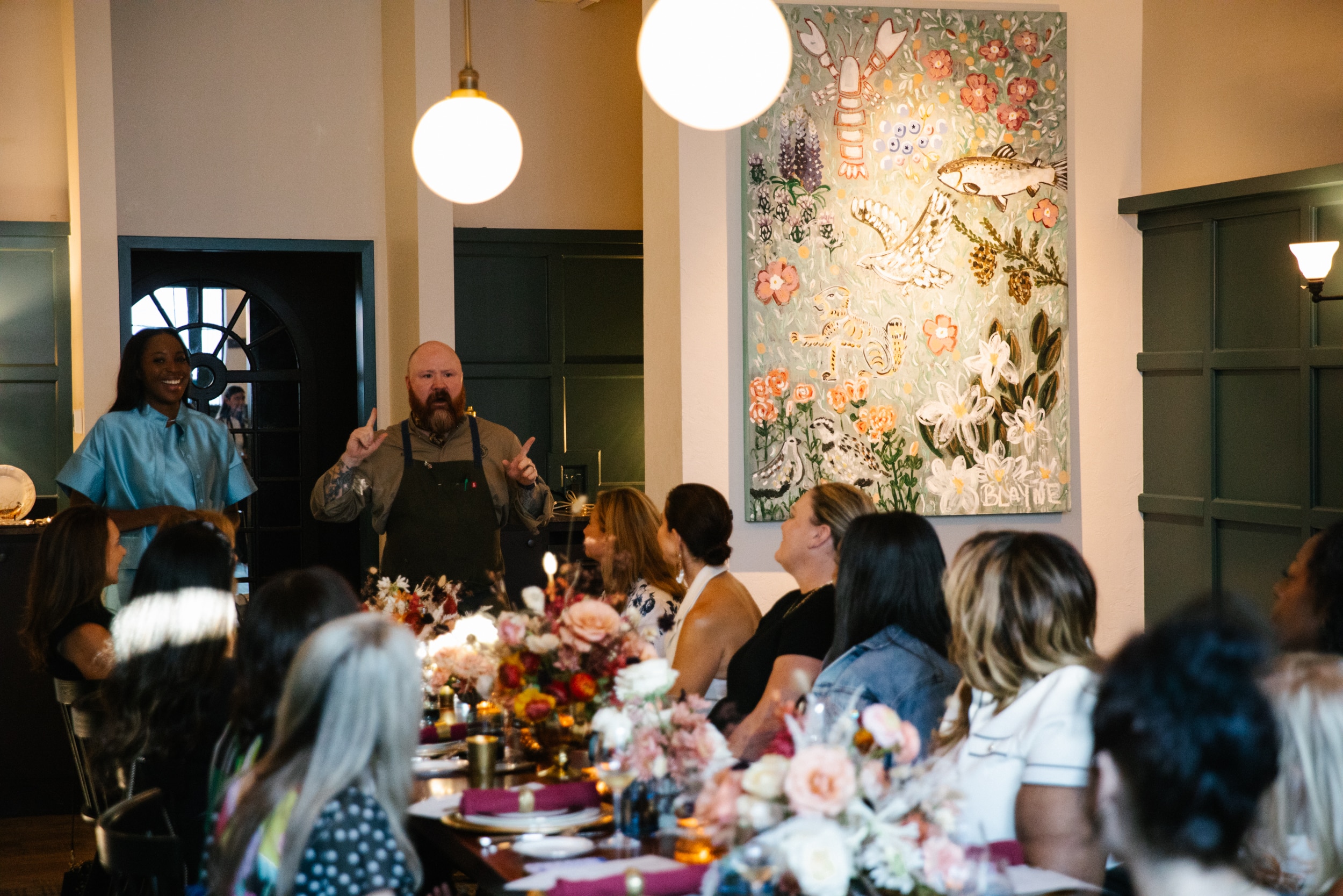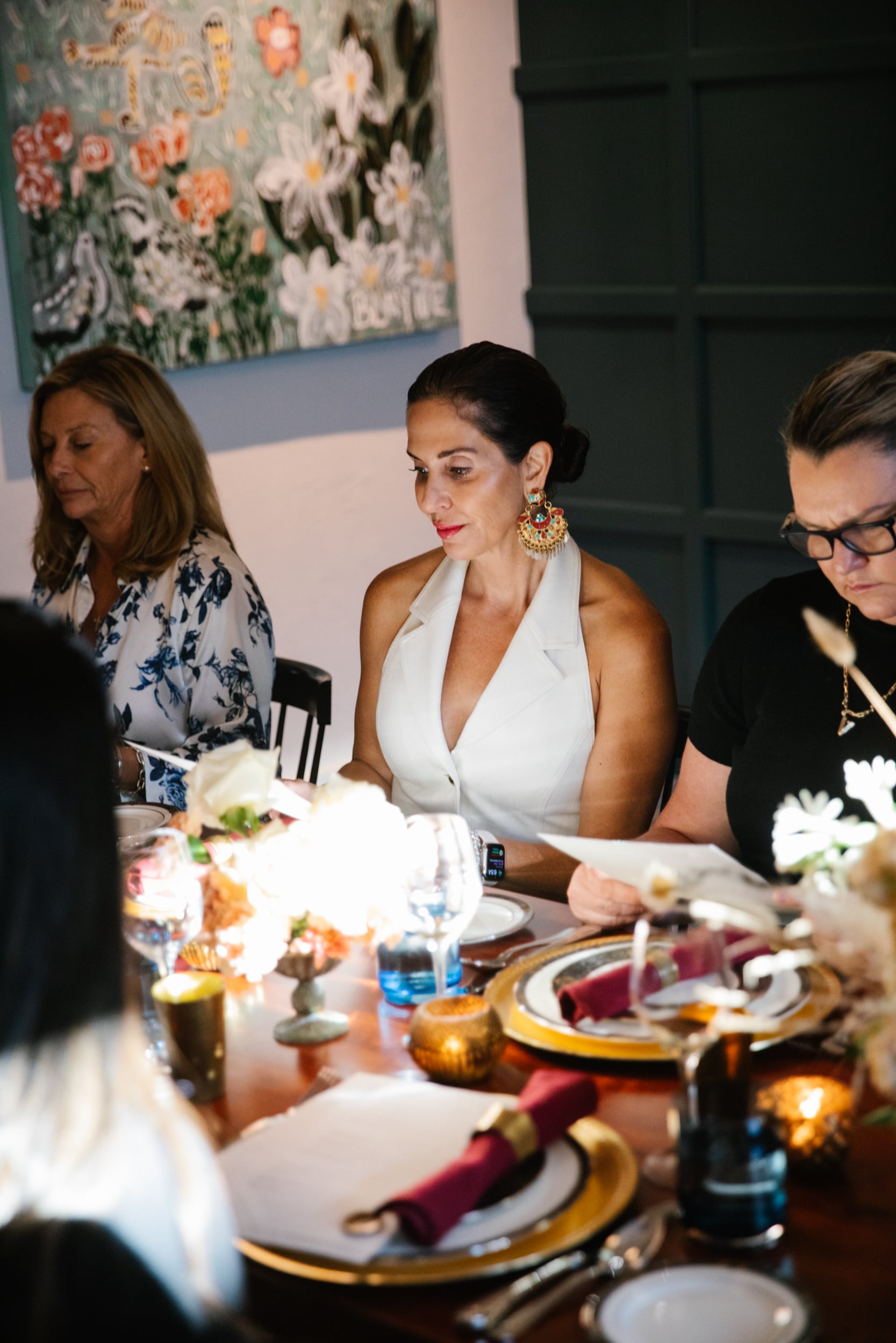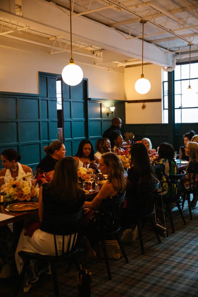 Look at the full table mid-dinner — every seat filled, globe pendants glowing overhead, women leaning toward one another across the florals and candlelight, deep in the kind of conversation that only happens when a room feels safe enough for it. Glasses raised in a toast, not for the camera, but for each other.