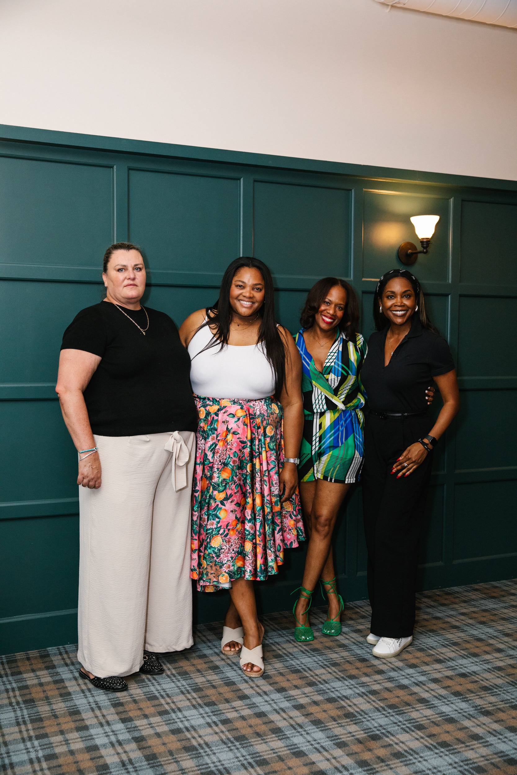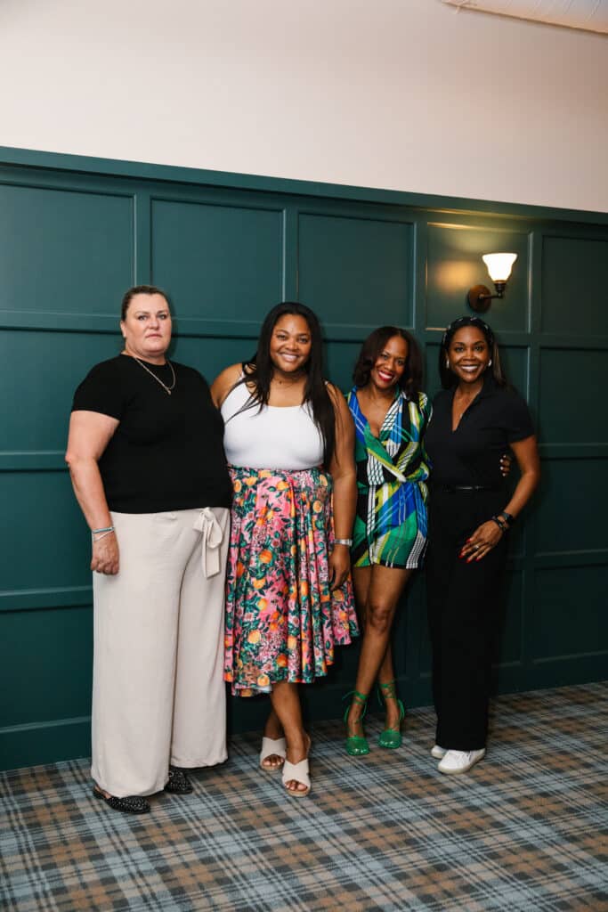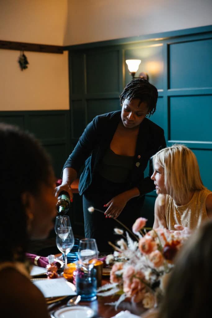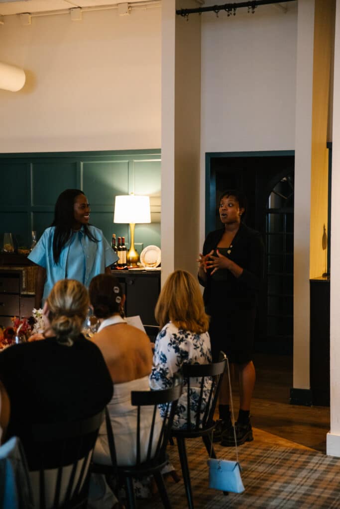 Look at the full table mid-dinner — every seat filled, globe pendants glowing overhead, women leaning toward one another across the florals and candlelight, deep in the kind of conversation that only happens when a room feels safe enough for it. Glasses raised in a toast, not for the camera, but for each other.