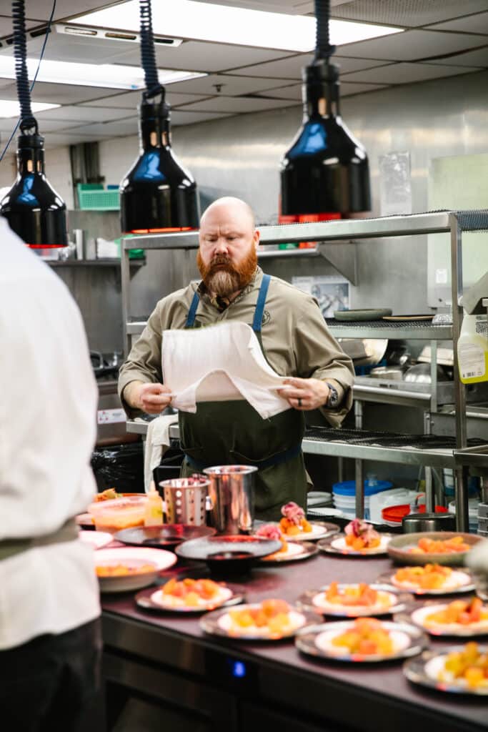 The kitchen photographs tell you everything you need to know about who he is. In one, he stands at the pass under the heat lamps, completely still, reading a ticket while a full row of plated heirloom tomato starters lines up in front of him — focused with the kind of quiet intensity that only comes from decades of service. In the other, he is bent over the pass with tweezers, finishing each plate himself, component by component. This is not a man who has handed his kitchen off. He is in it. Every single service.