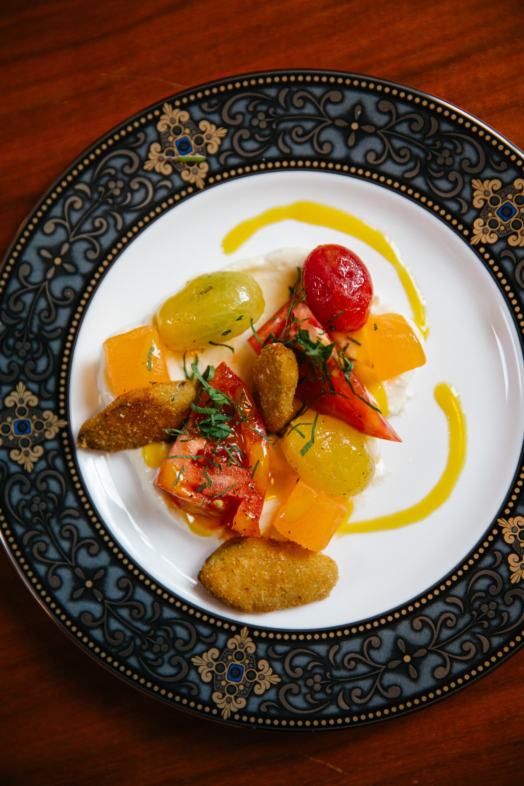 The starters were where the menu showed its full range. The Salad of Local Heirloom Tomatoes arrived plated on the Lenox navy china like a still life: compressed cantaloupe, fried okra, smoked fromage blanc, saffron, and celery salt. The colors alone — scarlet, gold, green, ivory — were worth pausing over before you touched it. The Ragout of Local Beans and Sweet Corn came with wood grilled pancetta stesa, dried corn mousse, and cornbread crunch — Georgia’s harvest elevated without apology. The Scottish Style Cheese Dumplings, served with chili braised collards, smoked tomatillos, and a grilled onion and huitlacoche suiza, were the most quietly surprising dish of the starters — Scotland and the South completing each other’s sentences in a single bite.