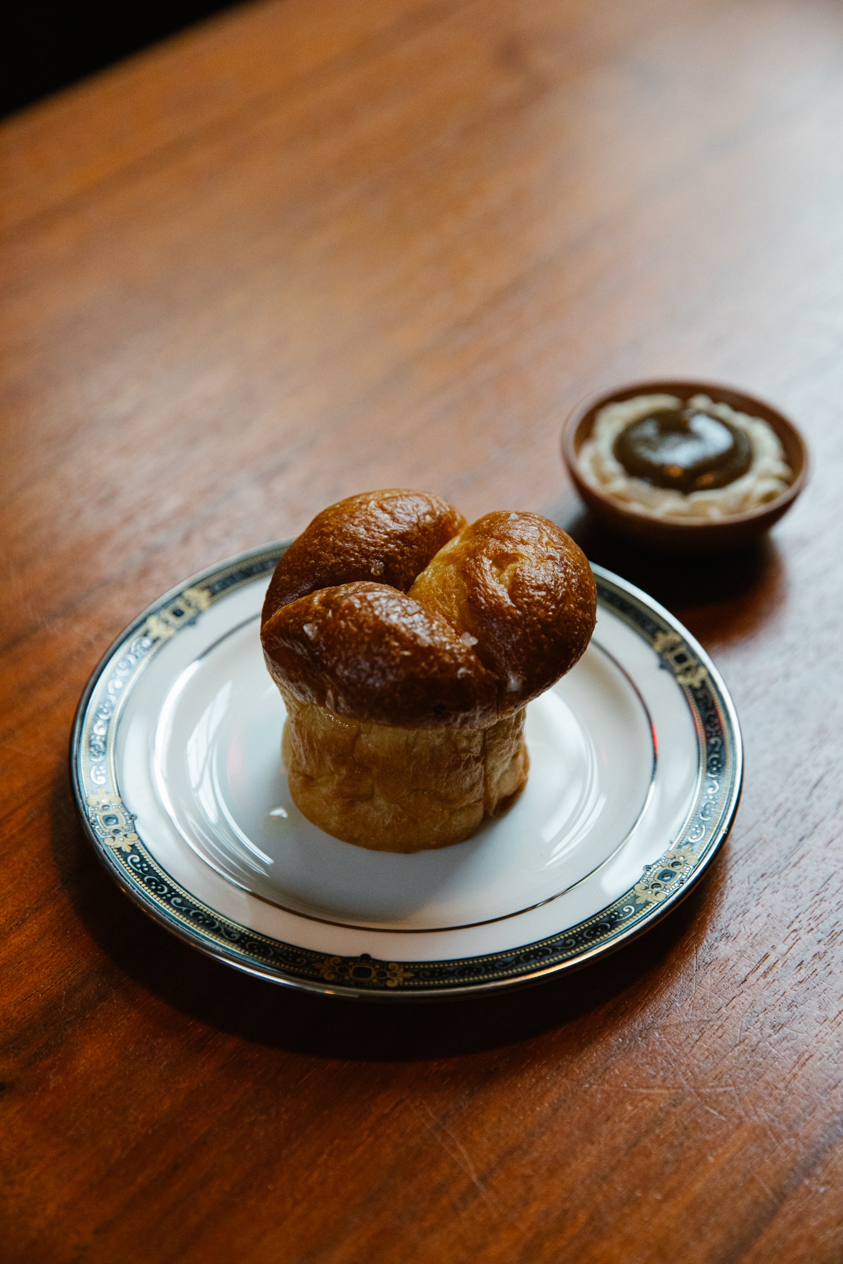 We began with an amuse of Cheese and Onion Tart with smoked feta and pickled onion cream — a single composed bite that immediately told you where the evening was headed. Precise. Confident. Deeply flavored.