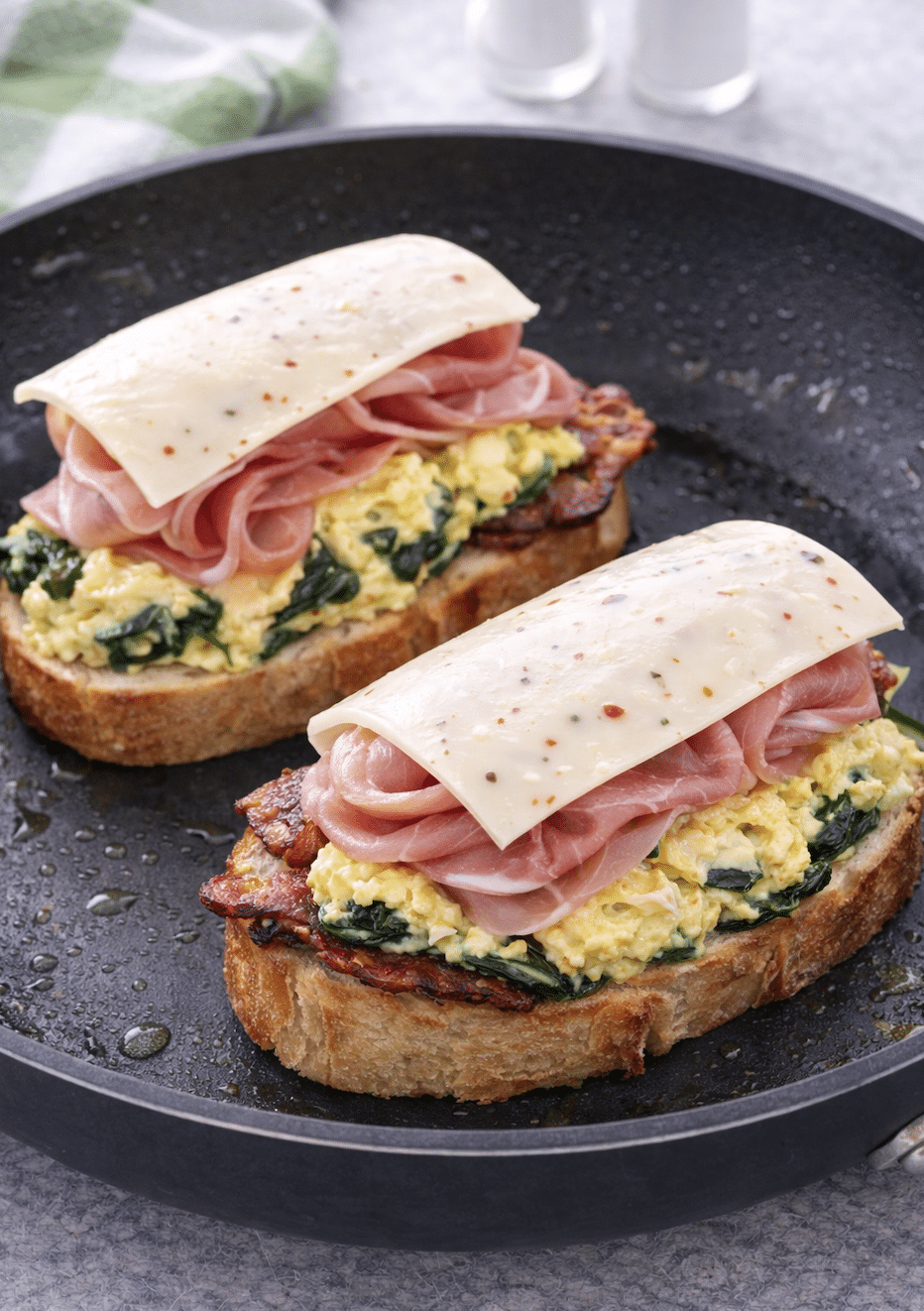- Assemble the open-face sandwiches. Return the buttered sourdough slices to the skillet over low heat. Layer each slice with:Pepper Jack cheeseCrispy baconScrambled eggsProsciuttoAnother slice of Pepper Jack cheese