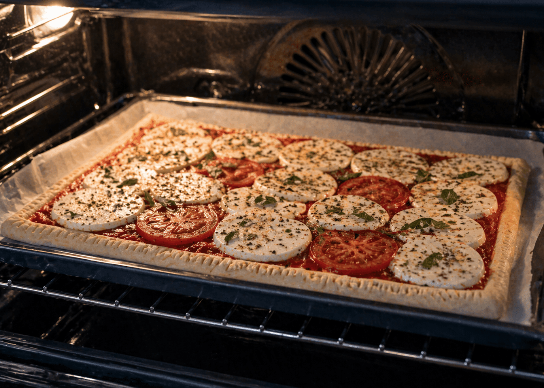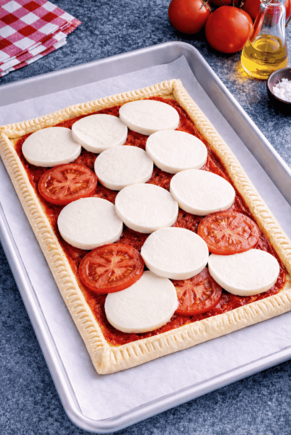 A solid, rimmed cookie sheet provides even heat distribution, which is essential for puff pastry to rise properly without burning on the bottom. It also keeps the pastry stable as the cheese melts and the tomatoes release moisture.