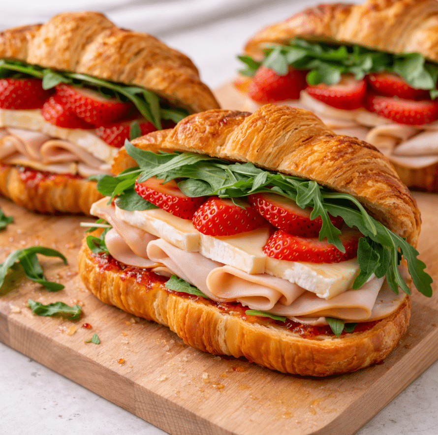 - Assemble the Sandwiches. Layer the croissants evenly with:Smoked turkey breastBrie slices (placed directly on the warm turkey so they soften slightly)Fresh basil leavesSliced strawberriesArugula