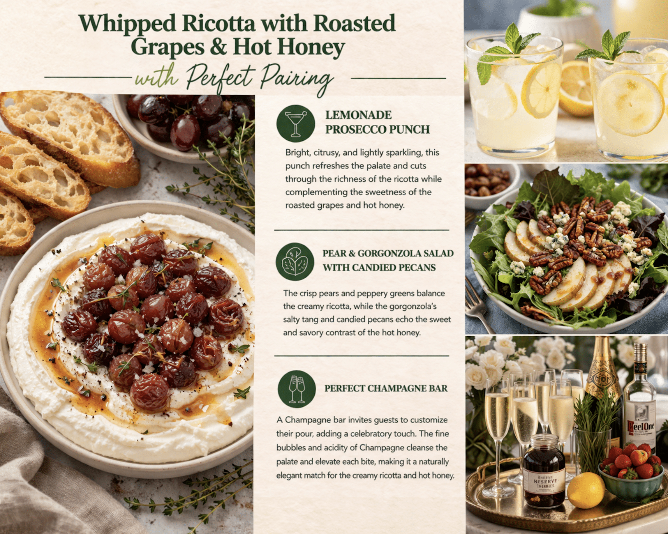 If I’m hosting, this is always a standout addition. A champagne bar invites guests to customize their drink, which adds an interactive and elevated touch. The acidity and fine bubbles of champagne cleanse the palate and provide the perfect counterpoint to the richness and sweet heat of the ricotta and grapes.