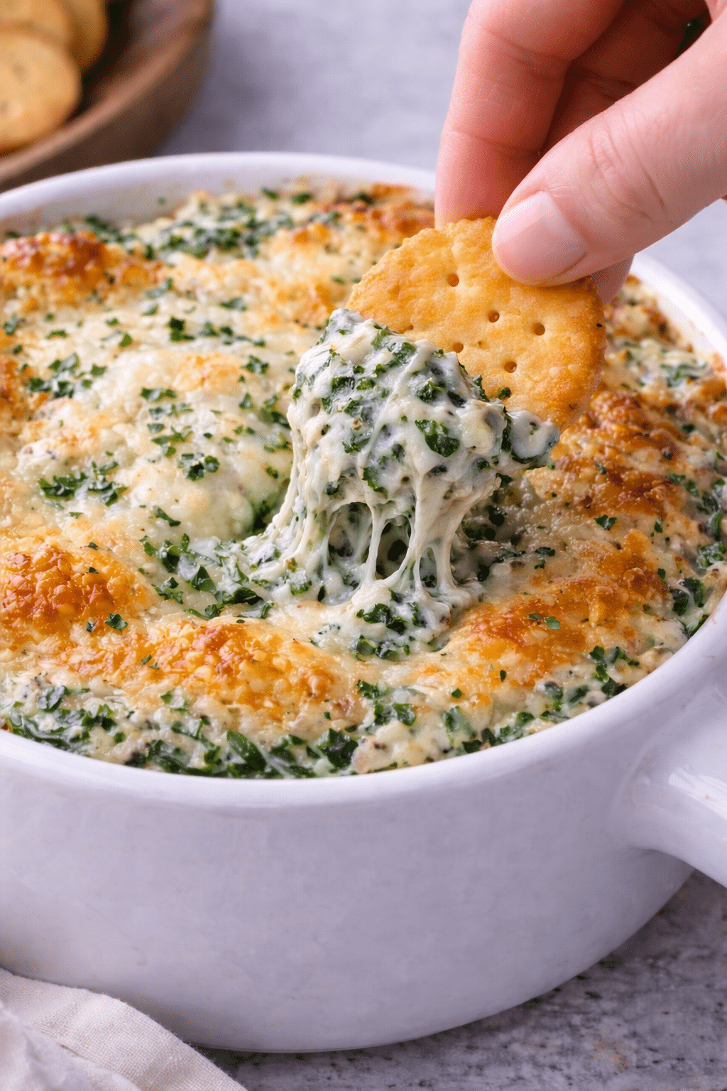 Fresh spinach adds brightness and keeps the dip from feeling overly rich.