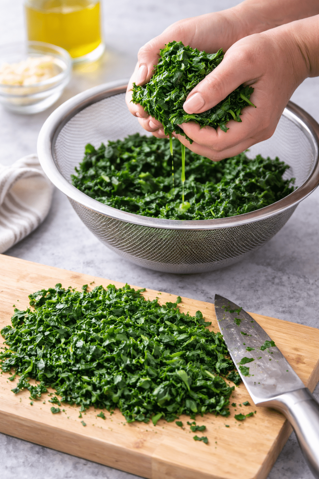• Steam or sauté the spinach until wilted. Let cool slightly, then squeeze out all excess moisture. Coarsely chop.