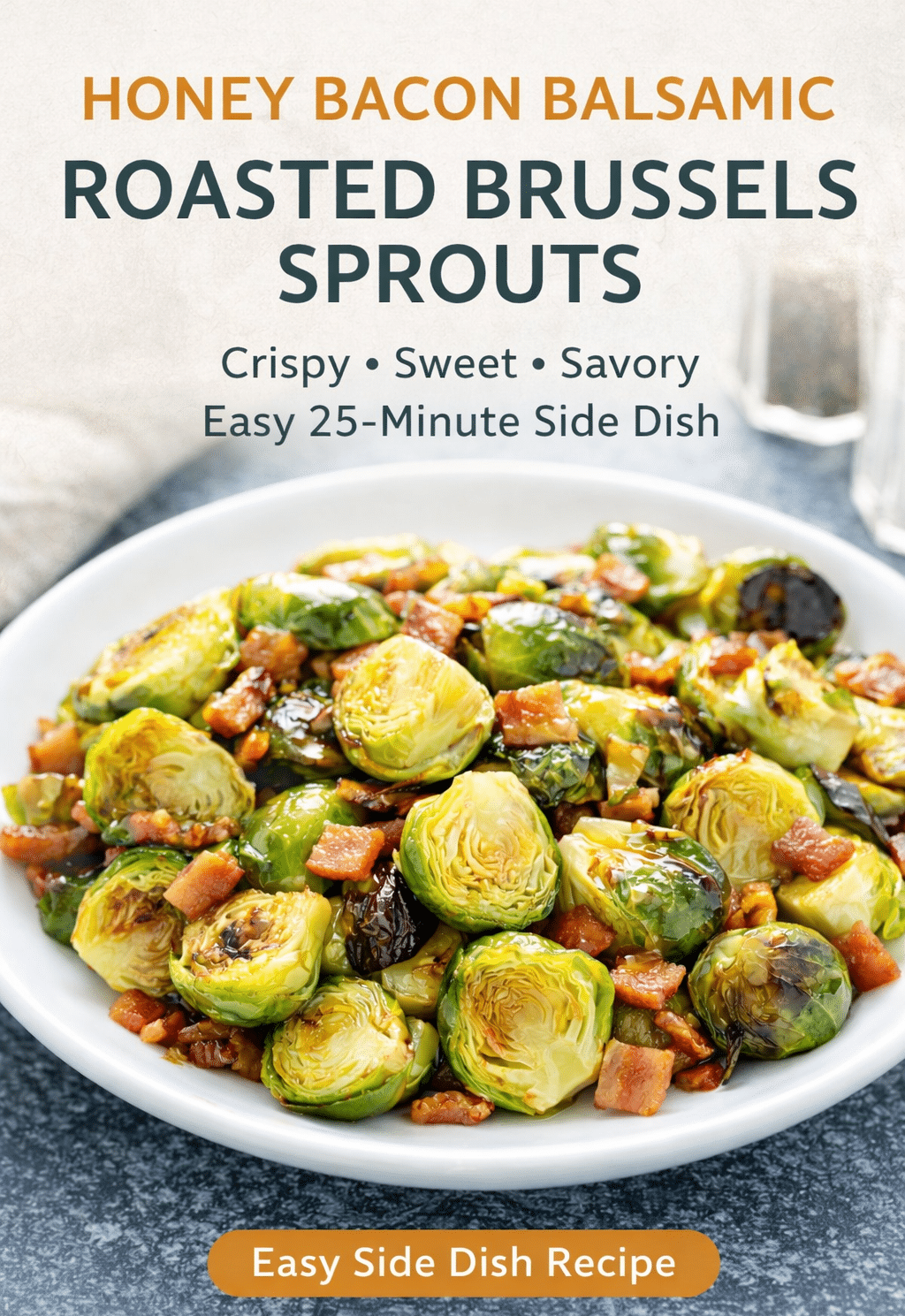 Honey Bacon Balsamic Roasted Brussels Sprouts is a roasted vegetable side dish where fresh Brussels sprouts are caramelized in the oven and finished with crispy bacon, balsamic vinegar, and a touch of honey for balance.