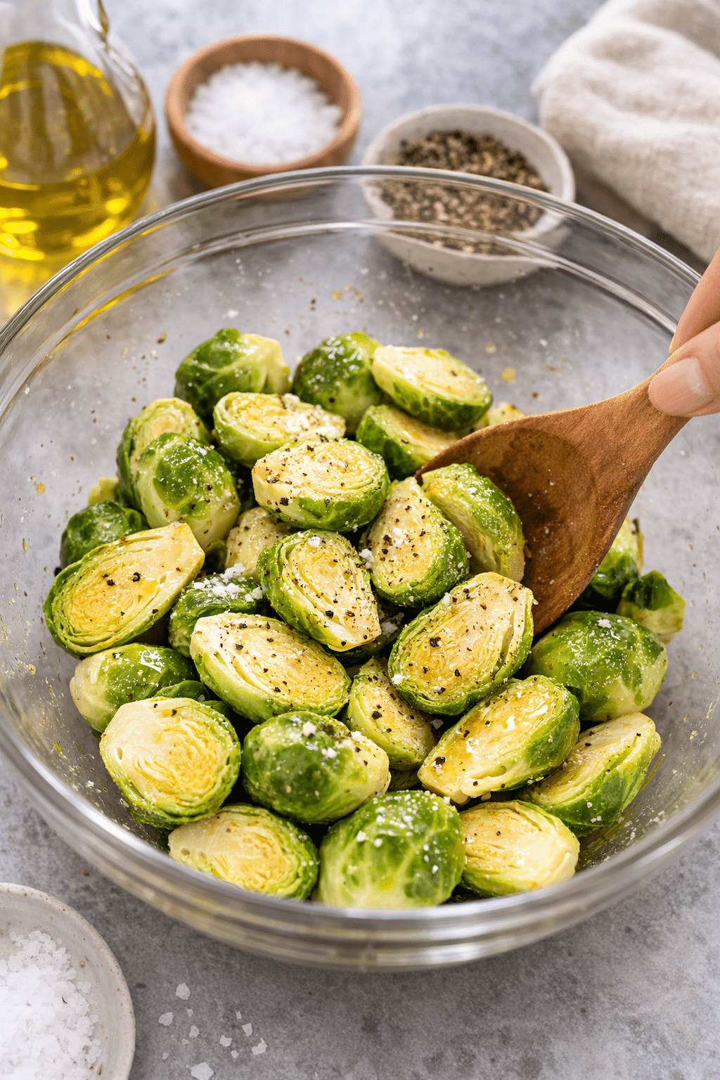 - In a large bowl, toss the halved brussels sprouts with two tablespoons of olive oil, kosher salt, and freshly cracked black pepper to coat them thoroughly.