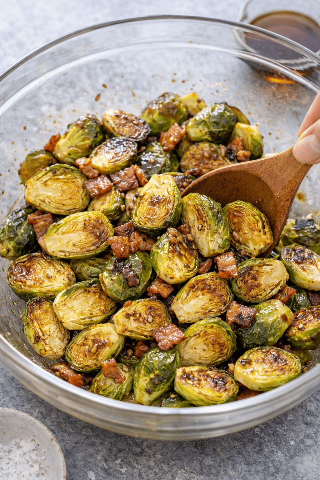 The Brussels sprouts are roasted at high heat until the edges become golden and slightly crisp while the centers stay tender. Once roasted, they’re tossed with smoky bacon, tangy balsamic vinegar, and a drizzle of honey that creates a glossy, flavorful coating.