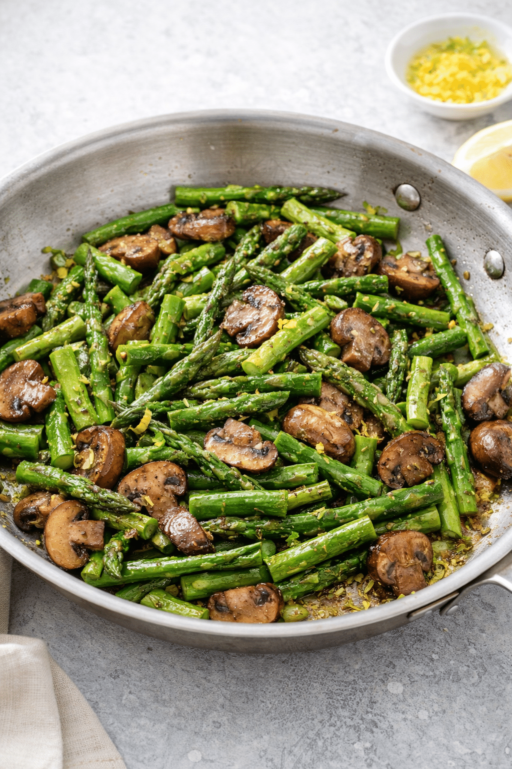 • Lemon zest – The zest is where the essential oils are, giving this dish a fresh, citrusy kick that complements the earthiness of the mushrooms and the asparagus.