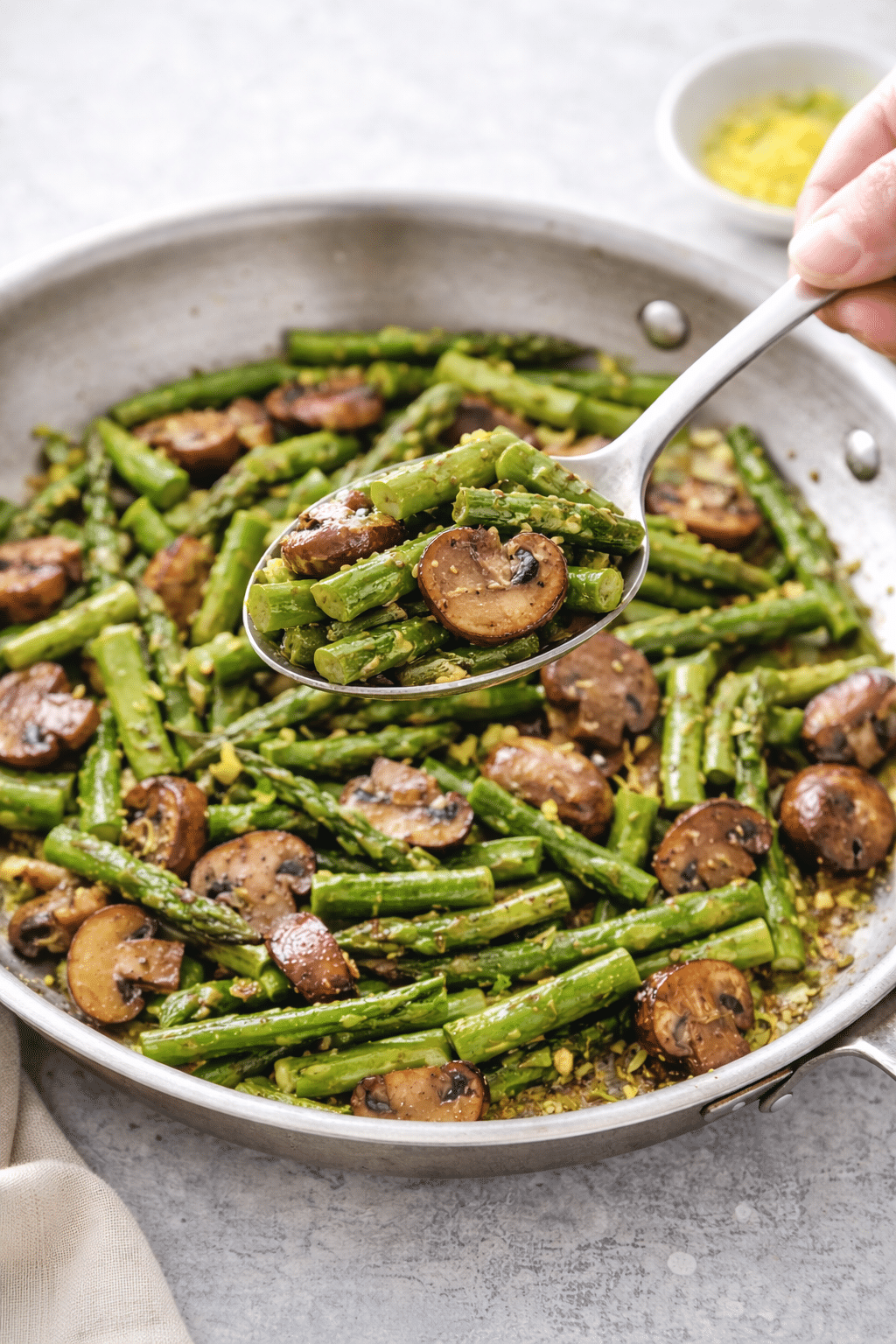 I use a large, heavy-bottom skillet so the asparagus and mushrooms cook evenly without overcrowding. It gives you that perfect tender texture with a light golden finish.