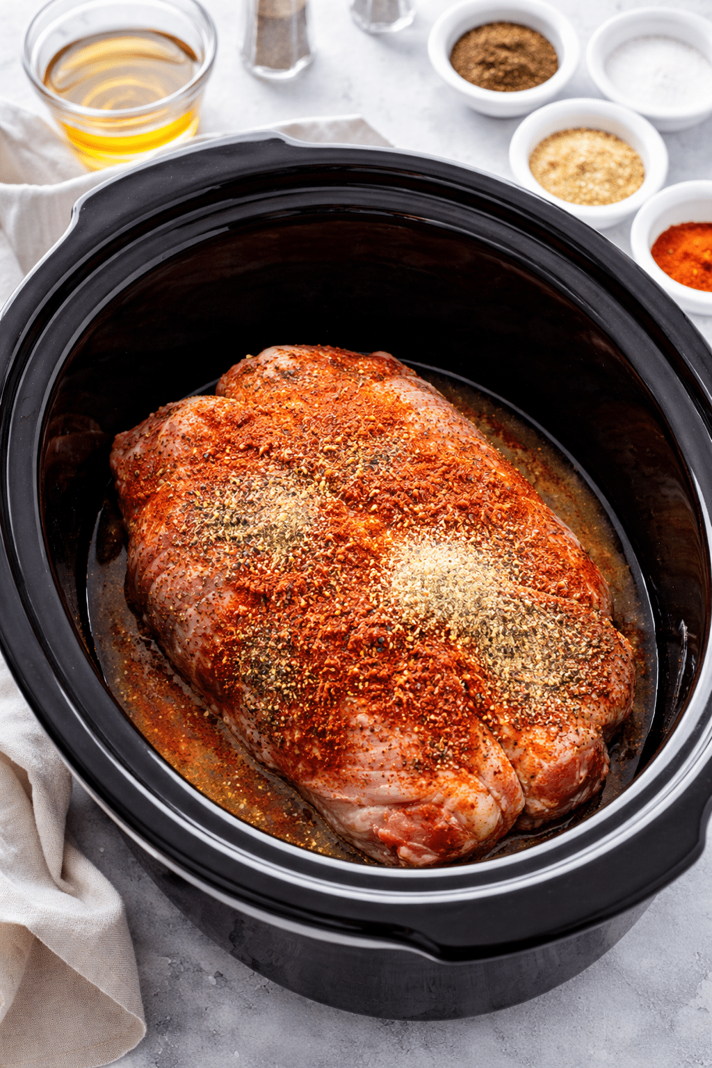 • Place the pork into the slow cooker, cover, and cook on low for 9 hours, until fork-tender.