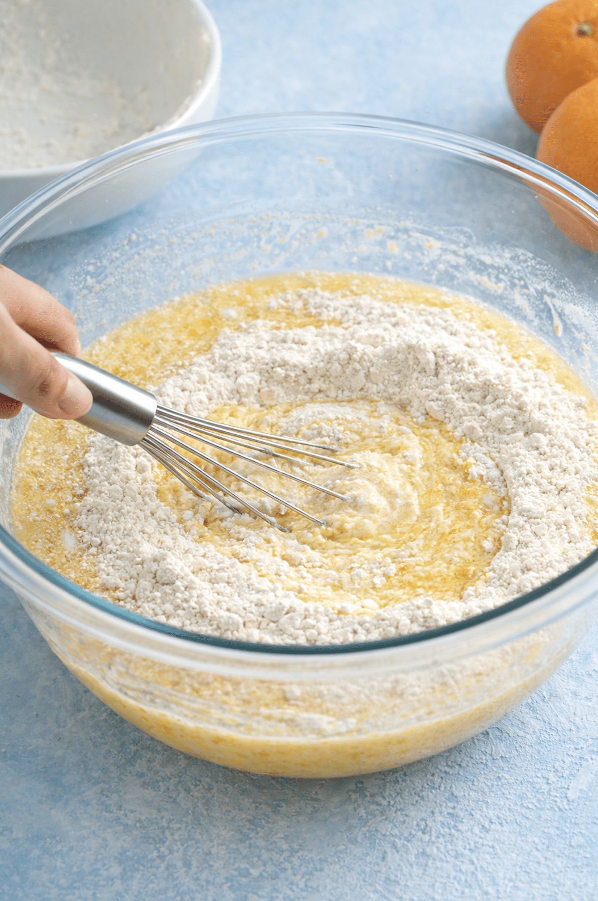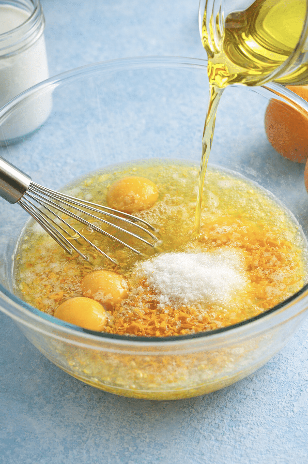 - Add the eggs to the orange zest and whisk well to mix. Whisk 1 cup of sugar until it lightens, about 1 minute. Whisk in the oil, followed by the milk.