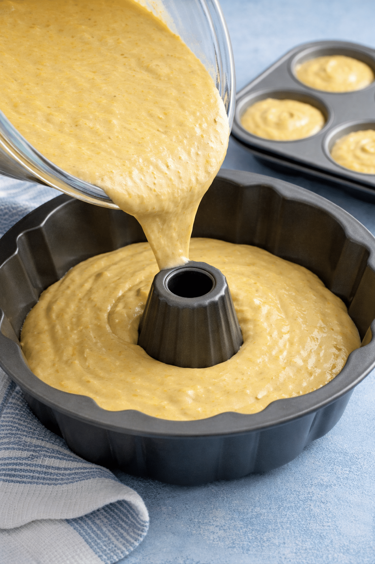- Pour the batter into the bundt cake pan (Don't fill to the brim). There will be a little excess batter, depending on your pan size. (I normally just add it to a cupcake pan and bake)