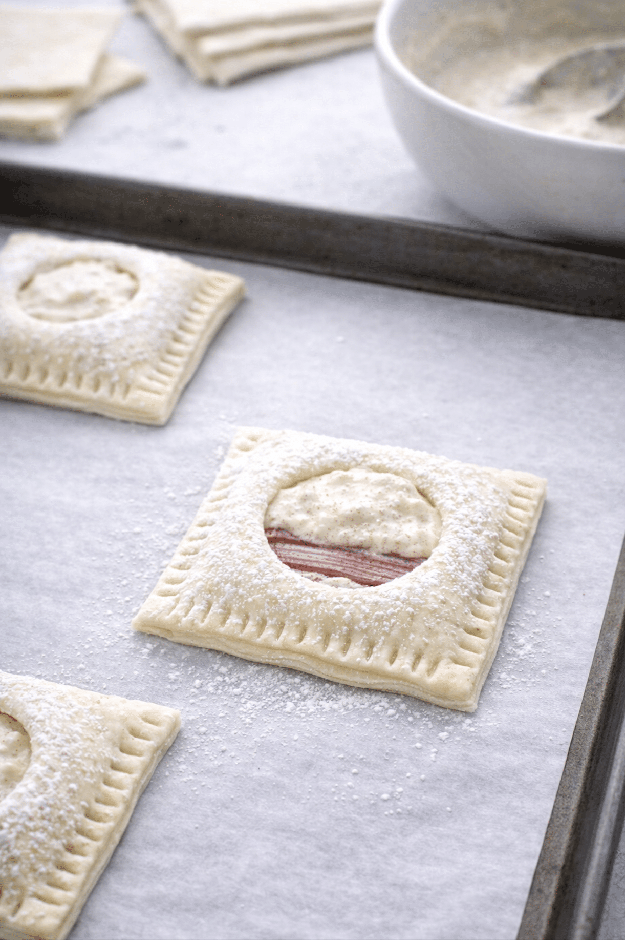- Place a pastry puff square on the parchment paper and carefully ladle about 1 tbsp of mascarpone mix into the center. Some may spill over the edge, but that’s okay. Layer on your rhubarb slices neatly, being certain to leave about ¼ inch on each side of the pastry.