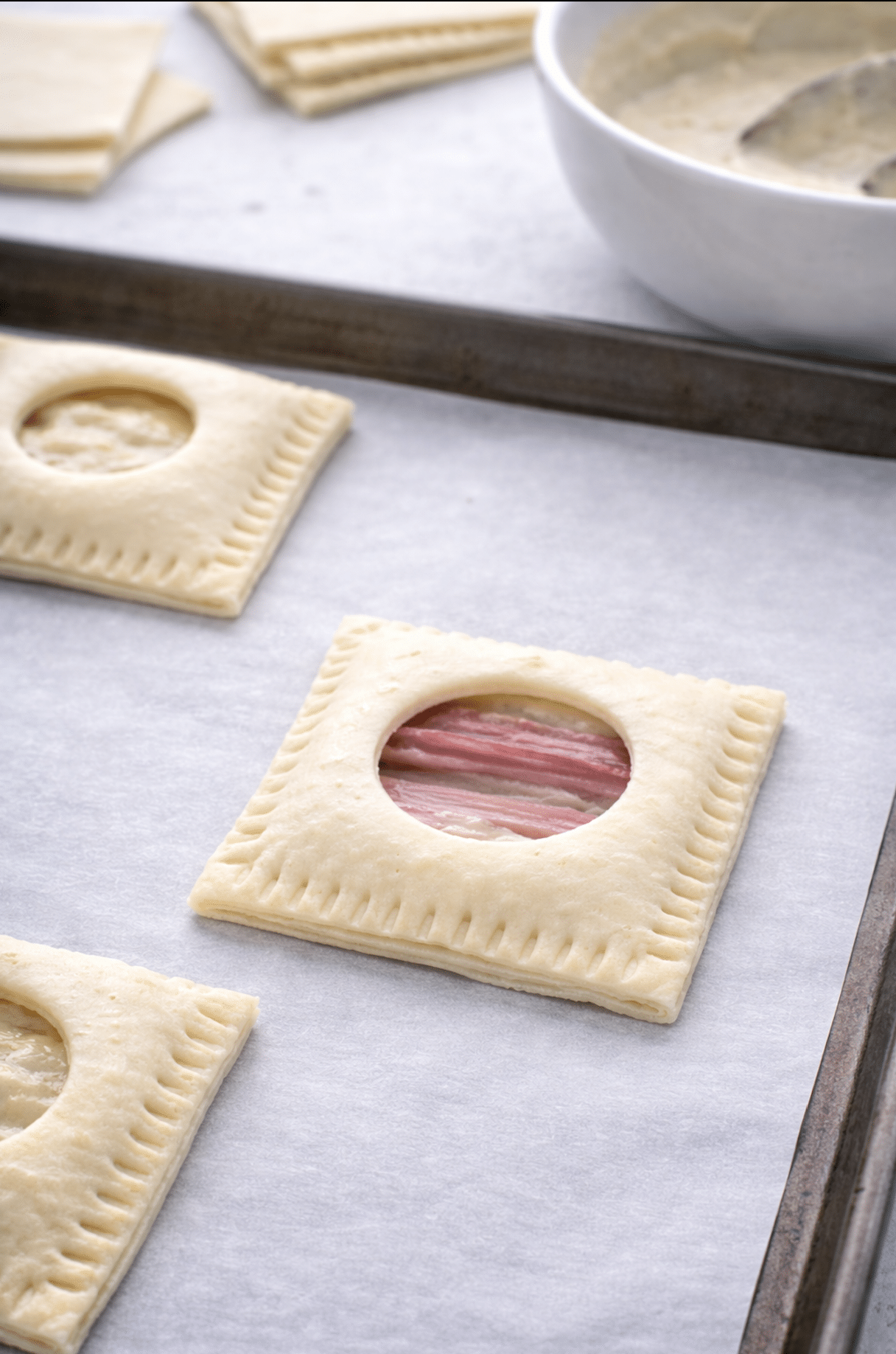 - Place the holed pastry puff on top of the rhubarb, making a little window for the rhubarb to peek through. Firmly press the puff pastry sides together to form a solid sealed edge.